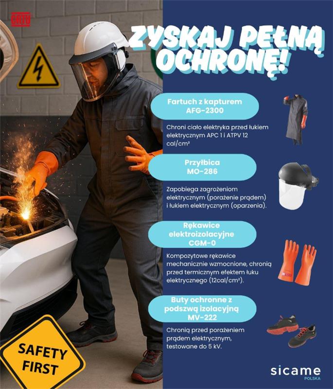 W Sicame Polska wierzymy, że każdy element “bezpiecznej zbroi” ma swoją rolę – zapoznaj się z poniższą grafiką i sprawdź, czy Twój strój i wyposażenie gwarantują Ci bezpieczną pracę przy pojeździe elektrycznym i hybrydowym.