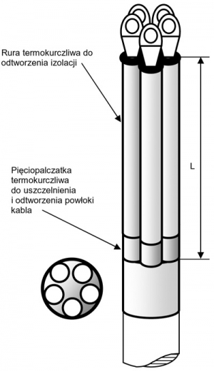 A head designed for terminating five-core cables in PVC, PE, XLPE insulation and sheath type Y(A)(n)KY, Y(A)KXS, X(A)KXS, Y(A)KwXS, X(A)KwXS with a rated voltage of 0.6/1 kV.