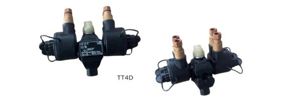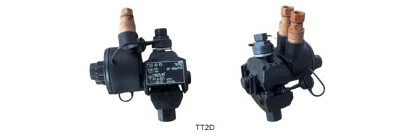 Zastosowanie: Służą do wykonywania połączeń elektrycznych między przewodami izolowanymi linii głównej przewodów i odgałęzienia o żyłach aluminiowych lub miedzianych, oraz do łączenia przewodów i kabli zarówno aluminiowych jak i miedzianych. Zaciski typu TT2D są wyposażone w satelitarny moduł odgałęźny. Umożliwia on podłączenie dwóch przewodów odgałęźnych z jednego zacisku. Zaciski typu TT4D są wyposażone w satelitarny moduł odgałęźny umożliwiający podłączenie odgałęźnych z jednego zacisku. czterech przewodów