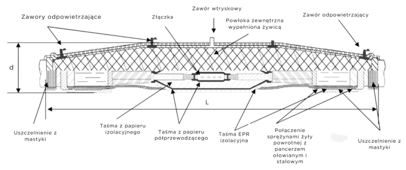 • Połączenie pancerzy ołowianych i stalowych za pomocą sprężyn o stałej sile docisku i plecionki miedzianej, ocynowanej o przekroju 50 mm2, zabezpieczone taśmą EPR, chroniące przed penetracją żywicy w to połączenie