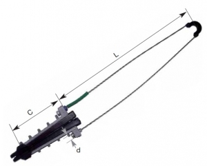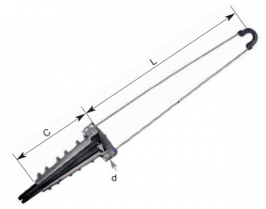 Tensioning clamp for ADSS and round fiber optic cables. Cone-shaped clamp with high mechanical and climatic strength.